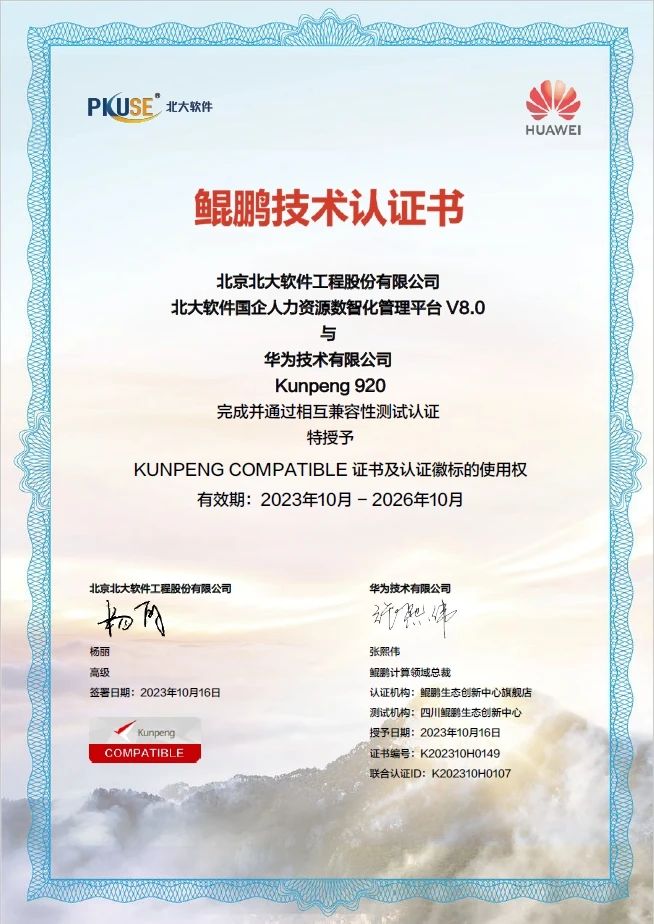近日,北京北大軟件工程股份有限公司(以下簡稱“北大軟件”)和華為技術有限公司(以下簡稱“華為”)完成并通過了相互兼容性測試互認證。北大軟件自主研發(fā)的國企人力資源數智化管理平臺V8.0(P8 DHR)順利通過的華為Kunpeng 920 CPU的相互兼容性測試,并獲得產品兼容性互認證明證書。經過嚴格的聯(lián)合測試驗證,雙方產品兼容性良好,運行穩(wěn)定、安全,可以滿足用戶的關鍵性應用需求。